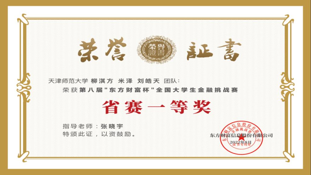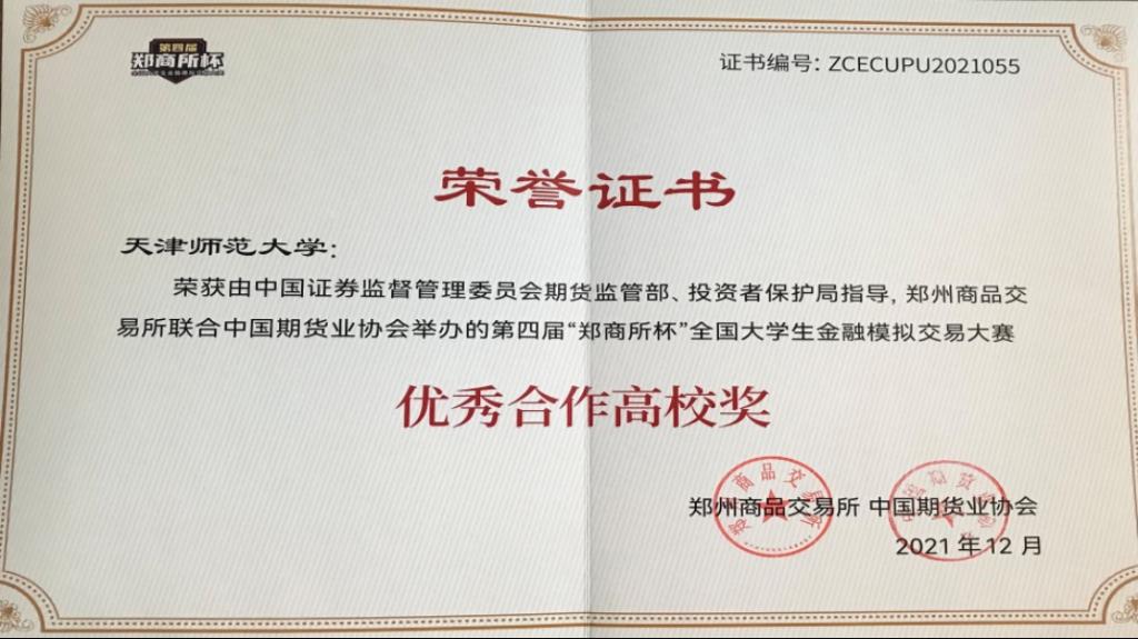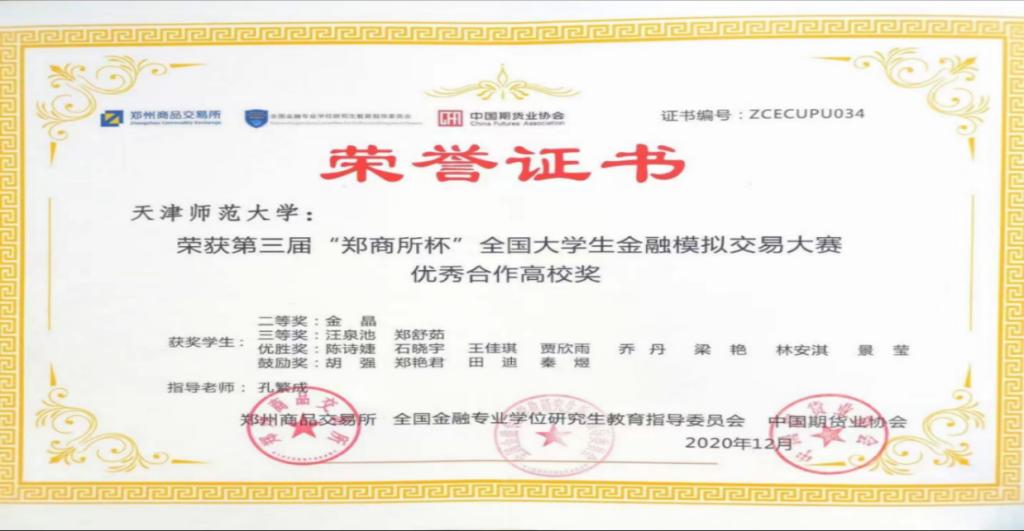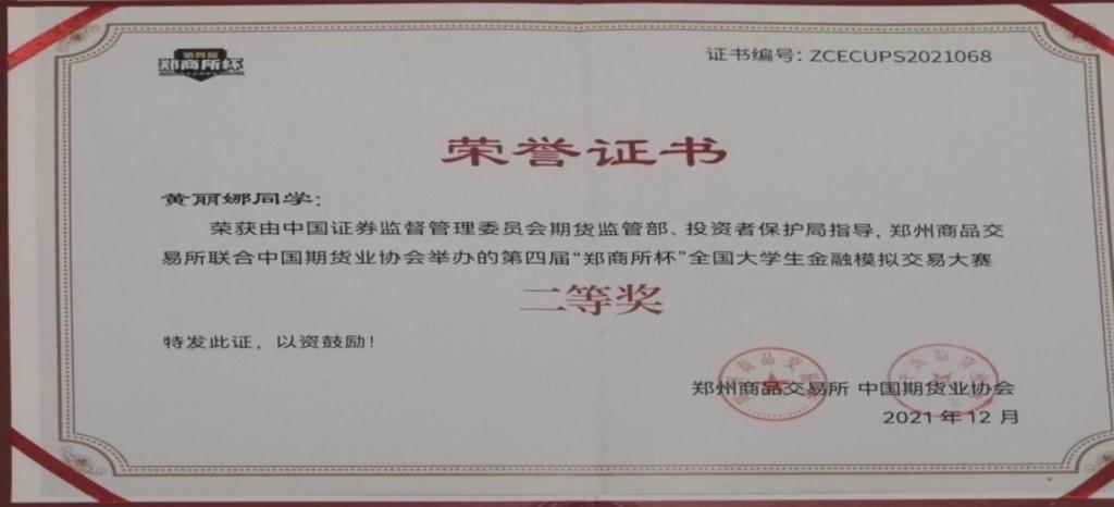 在第三届“郑商所杯”大赛中,投资学系共有15位同学获奖,M88官方网站获得优秀合作高校奖。在第四届“郑商所杯”大赛中成绩优异,黄丽娜、郭雯旗同学获得二等奖,王佳明、张泽宇同学获得三等奖,冯钰涵、贾智超、史怡君、王靖雯、胡玥同学获得鼓励奖,M88官方网站再次获得优秀合作高校奖。2022年,在由中国共产主义青年团举办的第八届“东财富杯”全国老员工金融精英挑战赛中,投资学专业员工获得全国二等奖1项,三等奖2项,省赛一等奖3项,省赛二等奖6项,省赛三等奖11项。