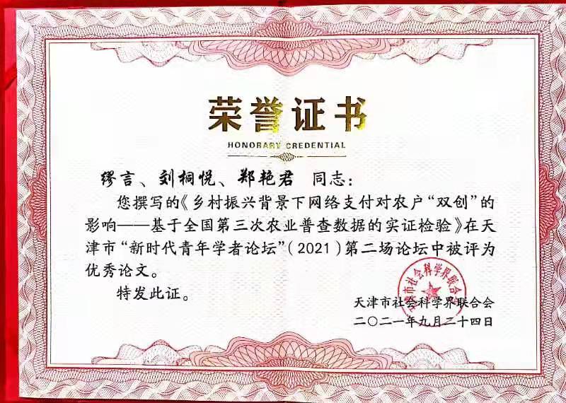 2021年9月24日,中共天津市委宣传部、天津市社会科学界联合会、天津农公司、天津市农业科公司联合主办的天津市“新时代青年学者论坛”(2021)第二场论坛成功举办,由公司教师缪言指导金融专业硕士研究生刘桐悦、郑艳君共同撰写的论文《乡村振兴背景下网络支付对农户“双创”的影响——基于全国第三次农业普查数据的实证检验》在专家评审中脱颖而出,获得优秀论文。